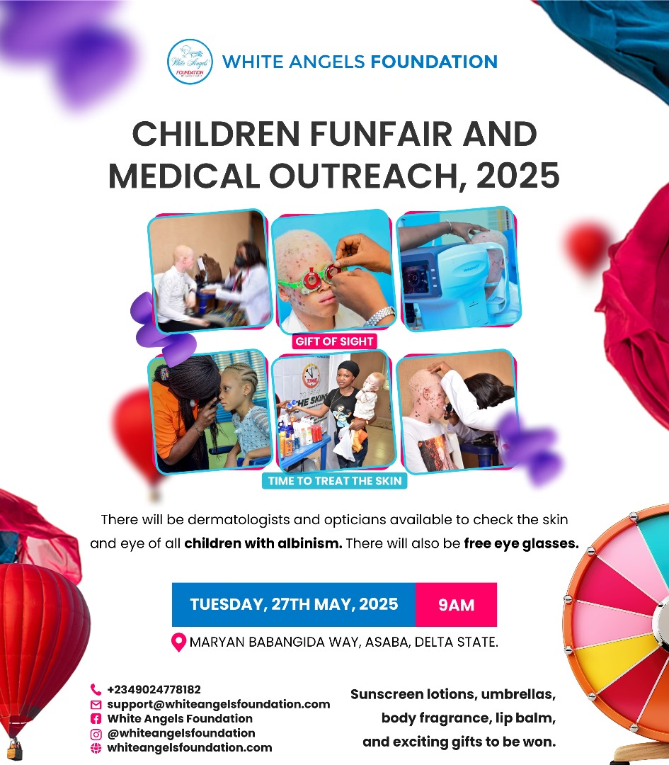 Join us on May 27th at Maryam Babangida Way, Asaba, Delta State, Nigeria for a special day dedicated to empowering and celebrating children with albinism. Our upcoming event combines the thrill of a funfair with the vital support of a medical outreach, ensuring a day filled with laughter, learning, and love.